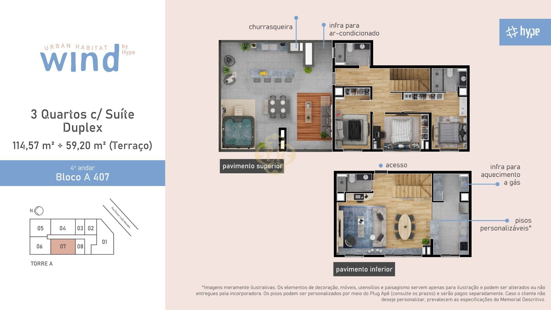 Esta luxuosa unidade conta com uma ampla área de 114,57m² divididos estrategicamente prezando o conforto e comodidade dentro de cada ambiente, a unidade conta com 3 dormitório na parte superior sendo 1 suíte e 1 banheiro social, já na parte inferior a unidade conta com uma sala de dois ambientes, sendo sala de estar e sala de jantar e uma ampla cozinha separada, com um banheiro social. A unidade conta com um Terraço amplo com 59,20m², um espaço ideal para lazer familiar, além disso a unidade conta com infraestrutura para implementação de ar condicionado e aquecimento de água a gás.