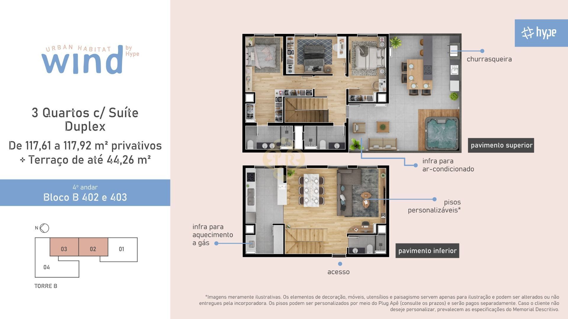 Esta luxuosa unidade conta com uma ampla área de 117,92m², divididos estrategicamente prezando o conforto e comodidade dentro de cada ambiente, a unidade conta com dois pavimentos, o pavimento superior é dividido em 3 dormitórios sendo 1 suíte, 2 banheiros sociais, já no pavimento inferior é dividido em uma sala de estar conjugada, uma área ampla para cozinha, uma sala de jantar e um banheiro social. A unidade conta com um terraço privativo de 44,26m², que pode ser decorado de acordo com o seu gosto pessoal, com um espaço ideal para lazer familiar.
