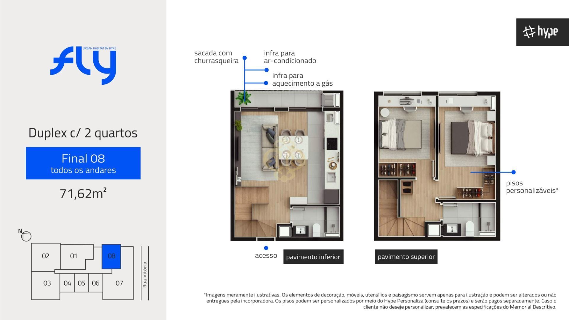Esta luxuosa unidade conta com uma área ampla de 71,62m² divididos estrategicamente em 2 pavimentos. no pavimento superior se encontra 2 quartos e um banheiro social, com um espaço ideal. Já no pavimento superior se encontra uma sala de 2 ambientes sendo sala de estar e sala de jantar e uma cozinha conjugada e um banheiro social. a unidade ainda conta com uma sacada com churrasqueira.A unidade possui infraestrutura para implementação de ar condicionado e aquecimento de água a gás.
