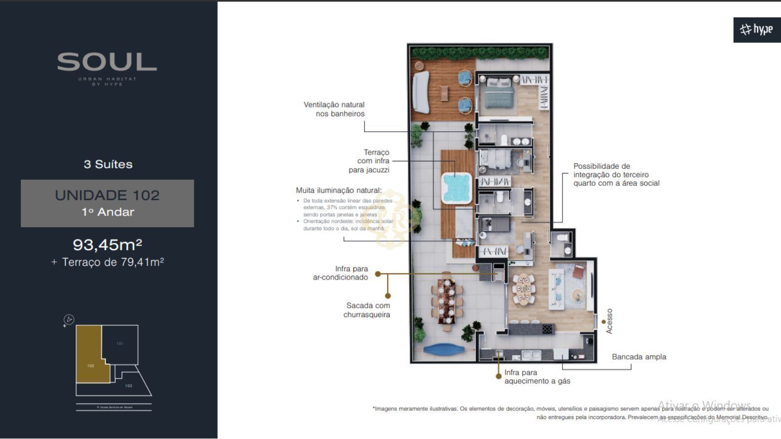 Esta luxuosa unidade conta com um espaço amplo de 93,45m², divididos em 3 suítes espaçosas, 1 sala ampla de dois ambientes sendo sala de estar e sala de jantar, com uma cozinha separada com um espaço ideal para uma melhor mobilidade e comodidade entre os ambientes, além da área de serviço, a unidade ainda conta com um espaço reservado para o bem estar e o lazer familiar, um terraço com uma área de 79,41m² com infraestrutura para Jacuzzi, pronto para ser decorado de acordo com seu gosto e preferência