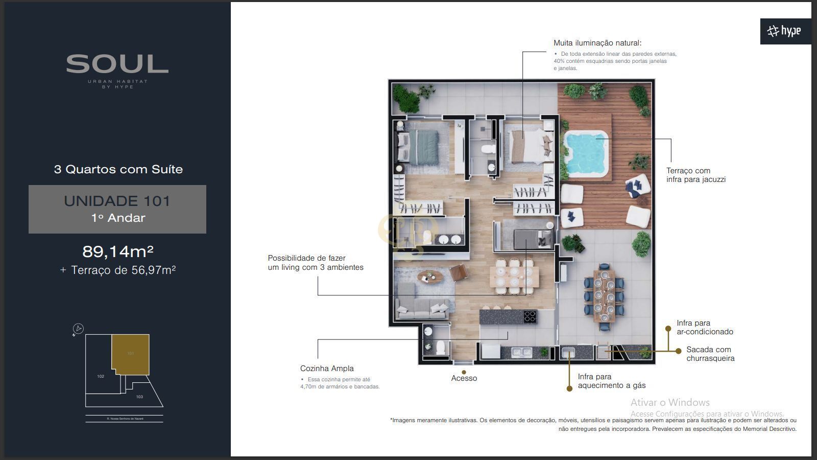 Esta luxuosa unidade conta com um espaço amplo de 89,14m², divididos em 3 dormitórios sendo 1 suíte com uma separação entre a área íntima e social, prezando a privacidade, 1 sala ampla de dois ambientes sendo, sala de estar e sala de jantar com uma cozinha espaçosa e área de serviço, a área conta com um lavabo social, na parte do terraço a unidade oferece uma ampla area de 56,97m² divididos para uma melhor mobilidade e conforto contendo uma sala na área externa, infraestrutura para implementação de Jacuzzi e uma varanda com um espaço ideal.