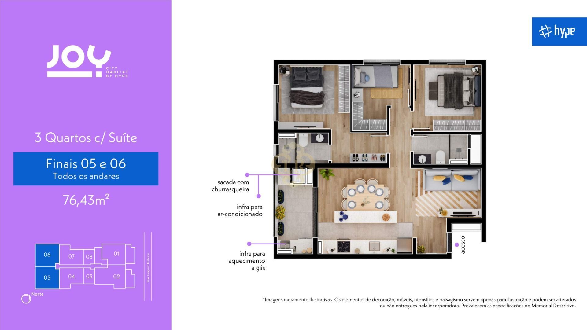 Esta luxuosa unidade oferece uma área ampla de 76,43m², divididos estrategicamente em 3 dormitórios sendo 1 suíte, os espaços dos quartos são separados para garantir a privacidade e conforto, conta também com uma sala de dois ambientes, sendo sala de estar e sala de jantar, com uma cozinha separada, além da sacada com churrasqueira que a unidade oferece.