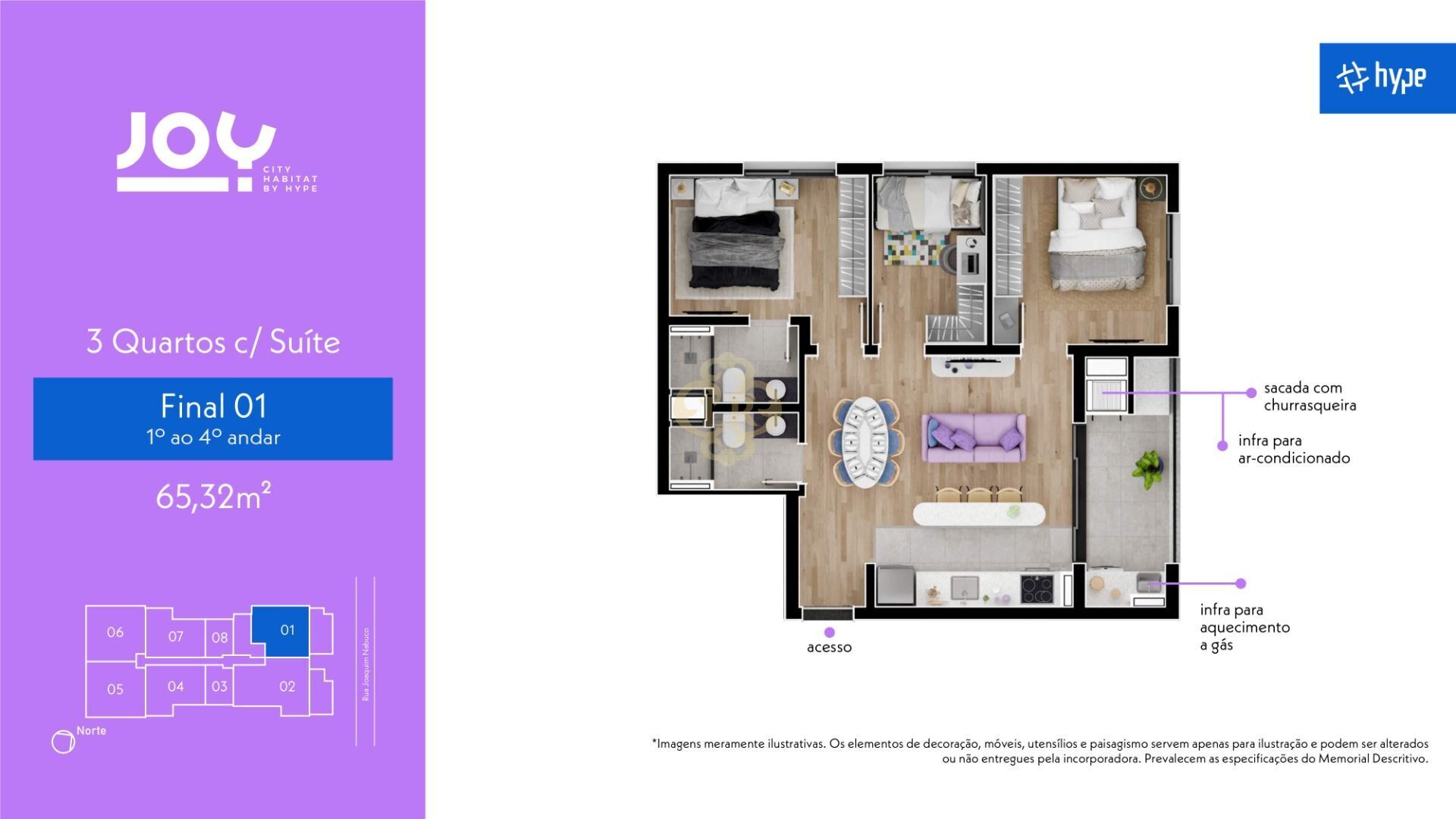 Esta luxuosa unidade oferece uma área ampla de 65,32m², divididos estrategicamente em 3 dormitórios sendo 1 suíte, os espaços dos quartos são separados para garantir a privacidade e conforto, conta também com uma sala de dois ambientes, sendo sala de estar e sala de jantar, com uma cozinha separada, além da sacada com churrasqueira que a unidade oferece.