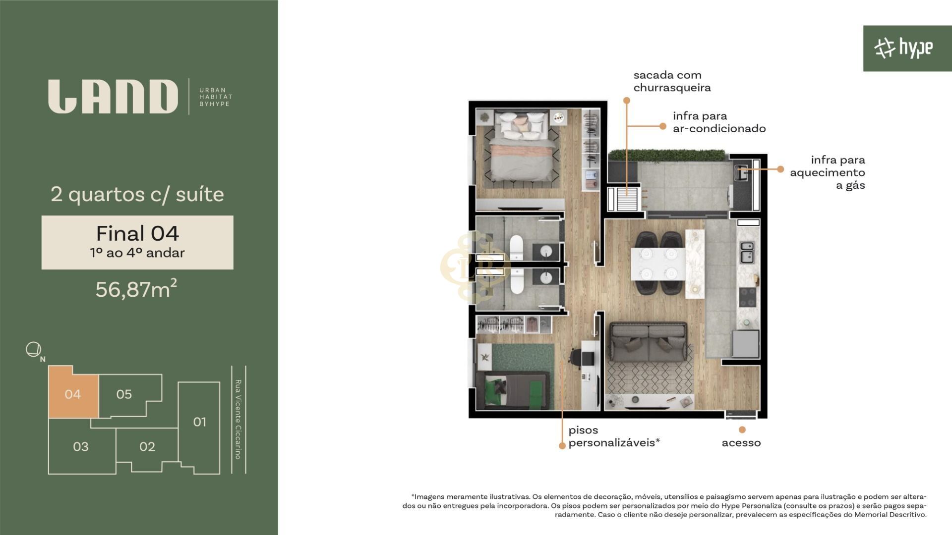 A unidade conta com um espaço amplo de 56,87m², divididos estrategicamente em 2 dormitórios, sendo 1 suíte, conta com uma sala de dois ambientes, sendo sala de estar e sala de jantar, com uma cozinha com um espaço amplo, além de contar com uma sacada com churrasqueira.