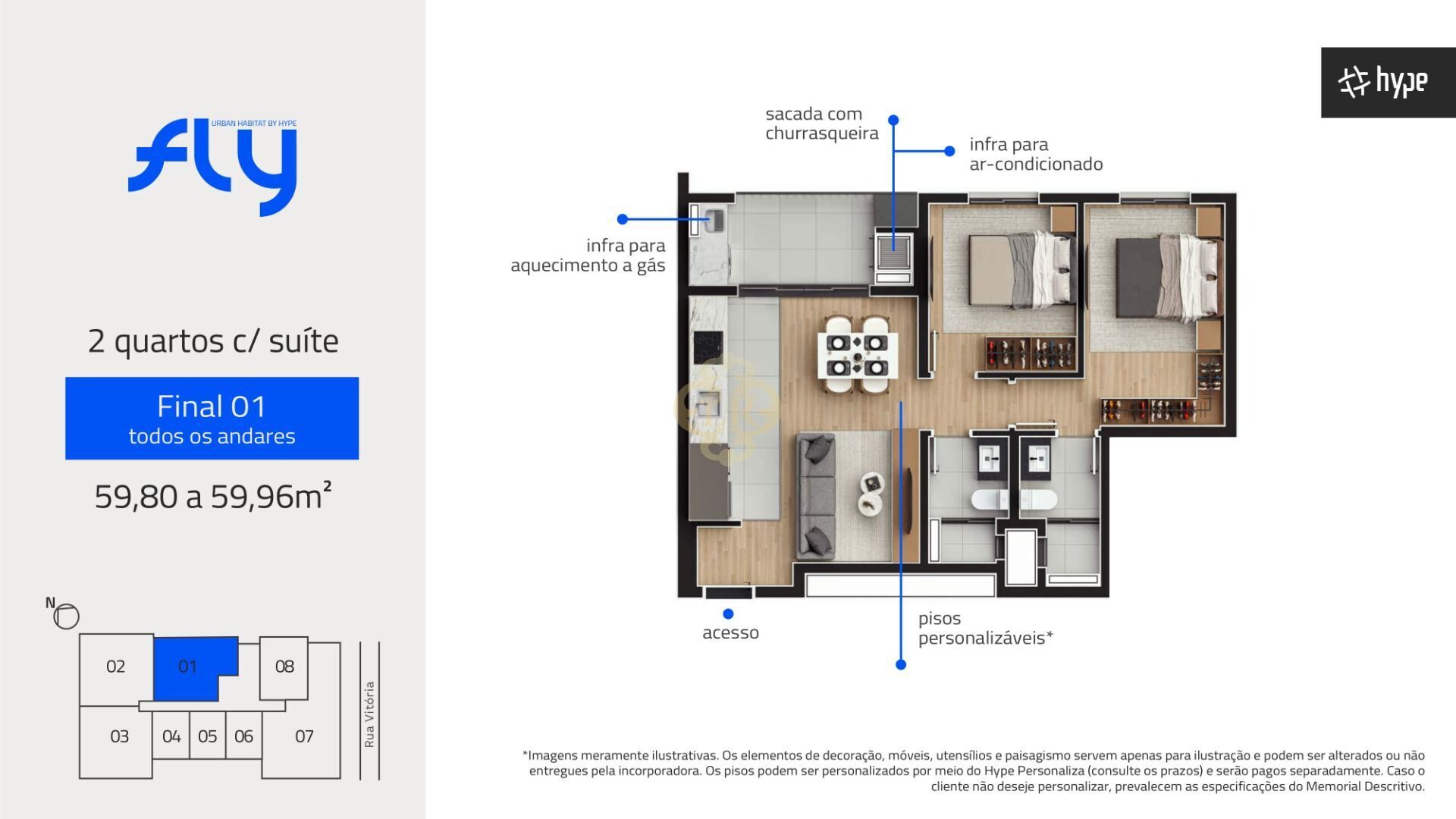 A unidade conta com uma área ampla de 59,96m² divididos estrategicamente em 2 quartos sendo 1 suíte, com um espaço ideal, conta também com uma sala de dois ambientes, sendo sala de estar e sala de jantar com a cozinha conjugada, além de possuir uma sacada com churrasqueira.