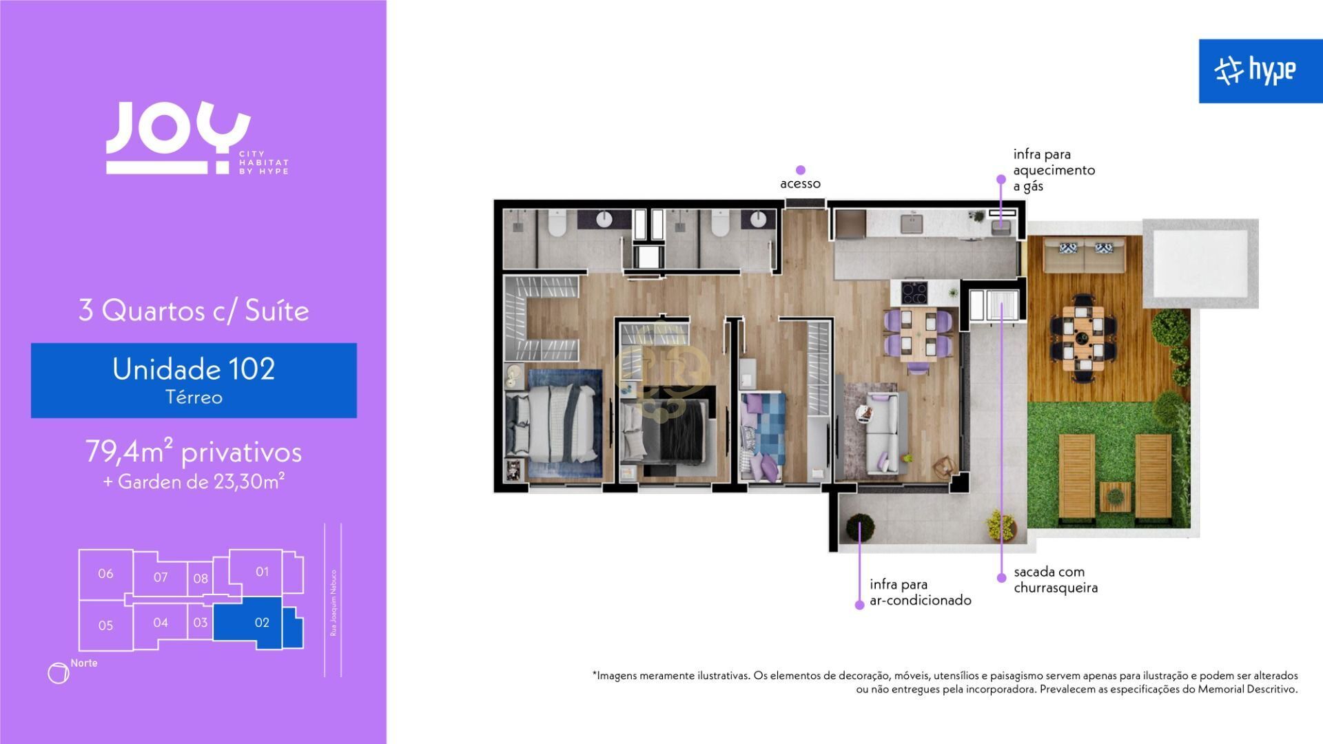 Esta luxuosa unidade oferece uma área ampla de 79,4m², divididos estrategicamente em 3 dormitórios sendo 1 suíte, os espaços dos quartos são separados para garantir a privacidade e conforto, conta também com uma sala de dois ambientes, sendo sala de estar e sala de jantar, com uma cozinha ampla e área de serviço, a unidade conta com um diferencial, um Garden amplo com uma área de 23,30m², um espaço ideal para que preza a liberdade, pode ser uma área de lazer familiar ou bem estar individual.