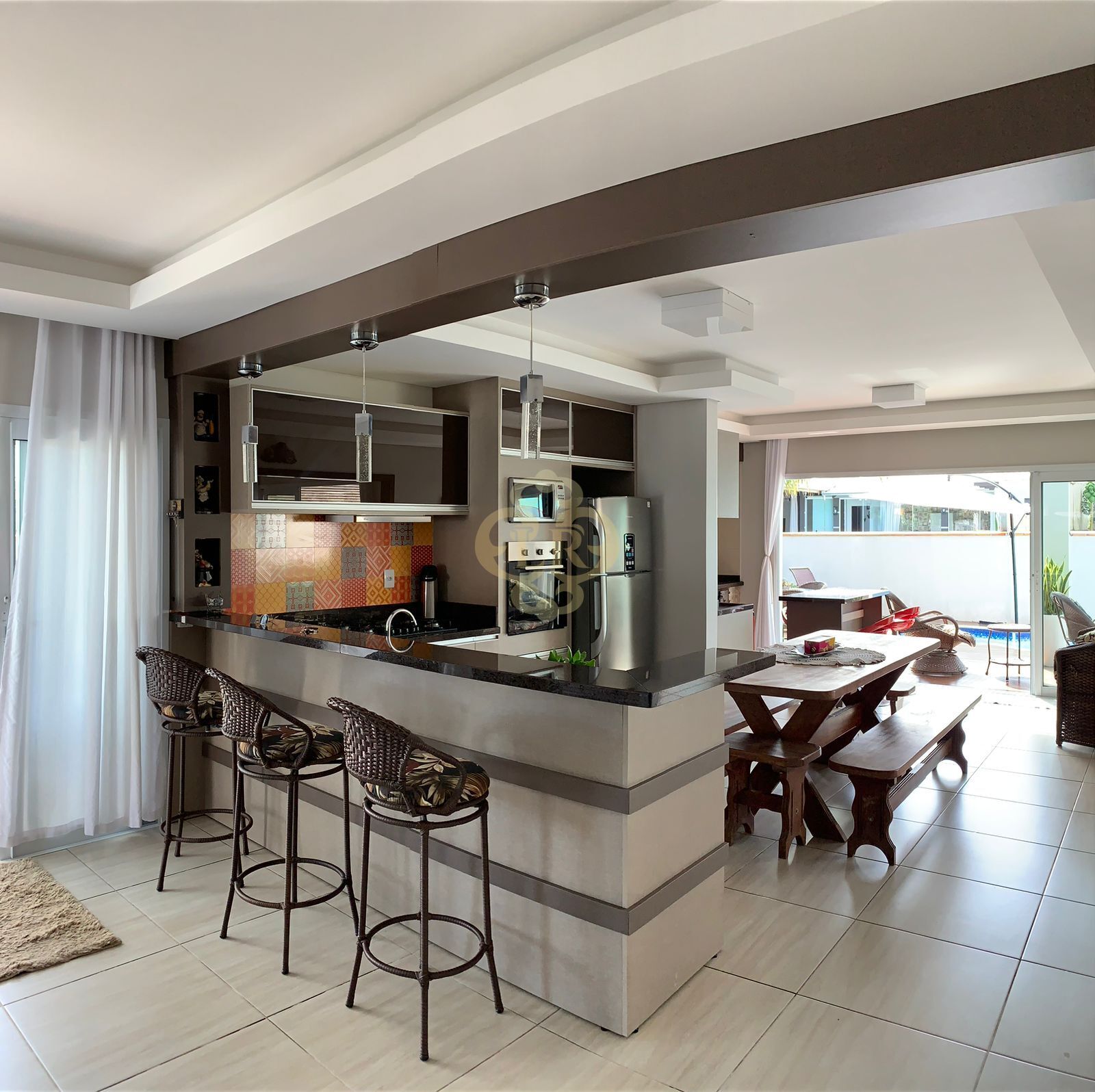 - Cozinha moderna integrada à churrasqueira, perfeita para reunir família e amigos.