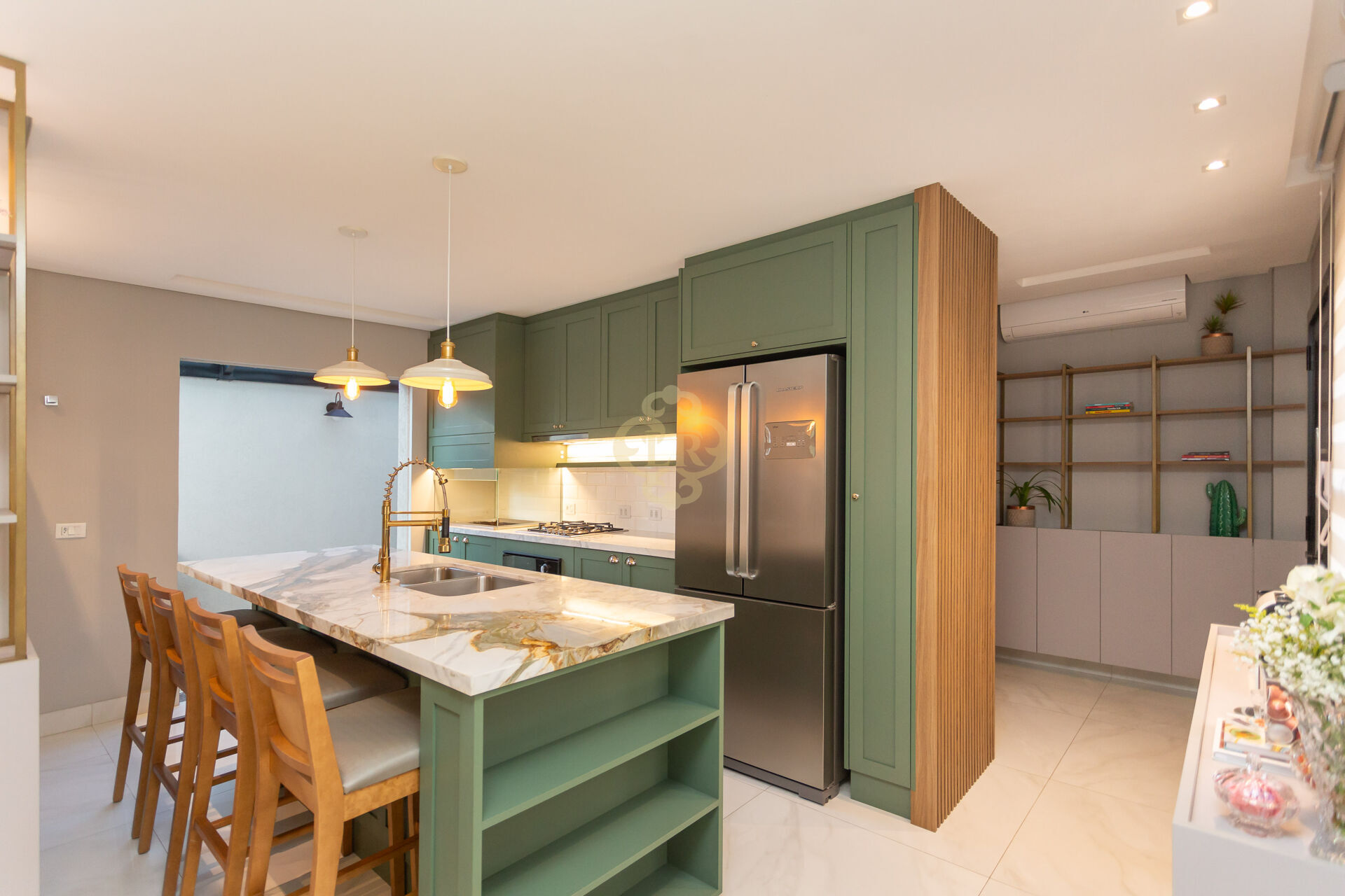 A cozinha possui móveis de alto padrão, com ilha e bancadas em mármore calacatta,